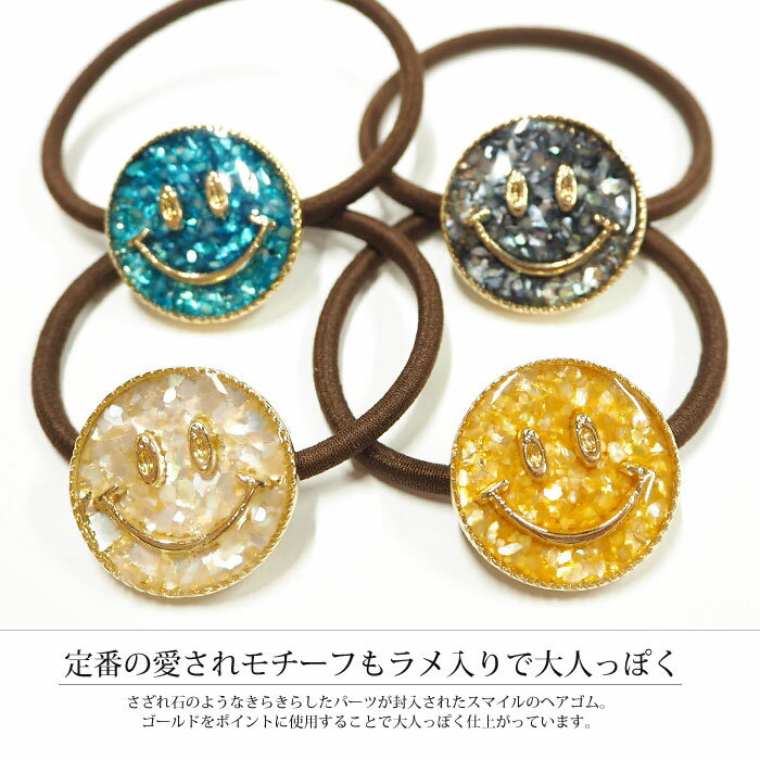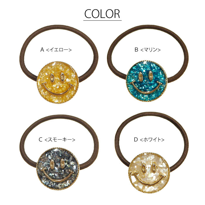 商品名 スマイル ヘアゴム(シェル&エポ) (dpy-680-009) STAFFコメント ベースにシェルが埋め込まれた、キラキラかわいいスマイルモチーフのヘアゴムです。